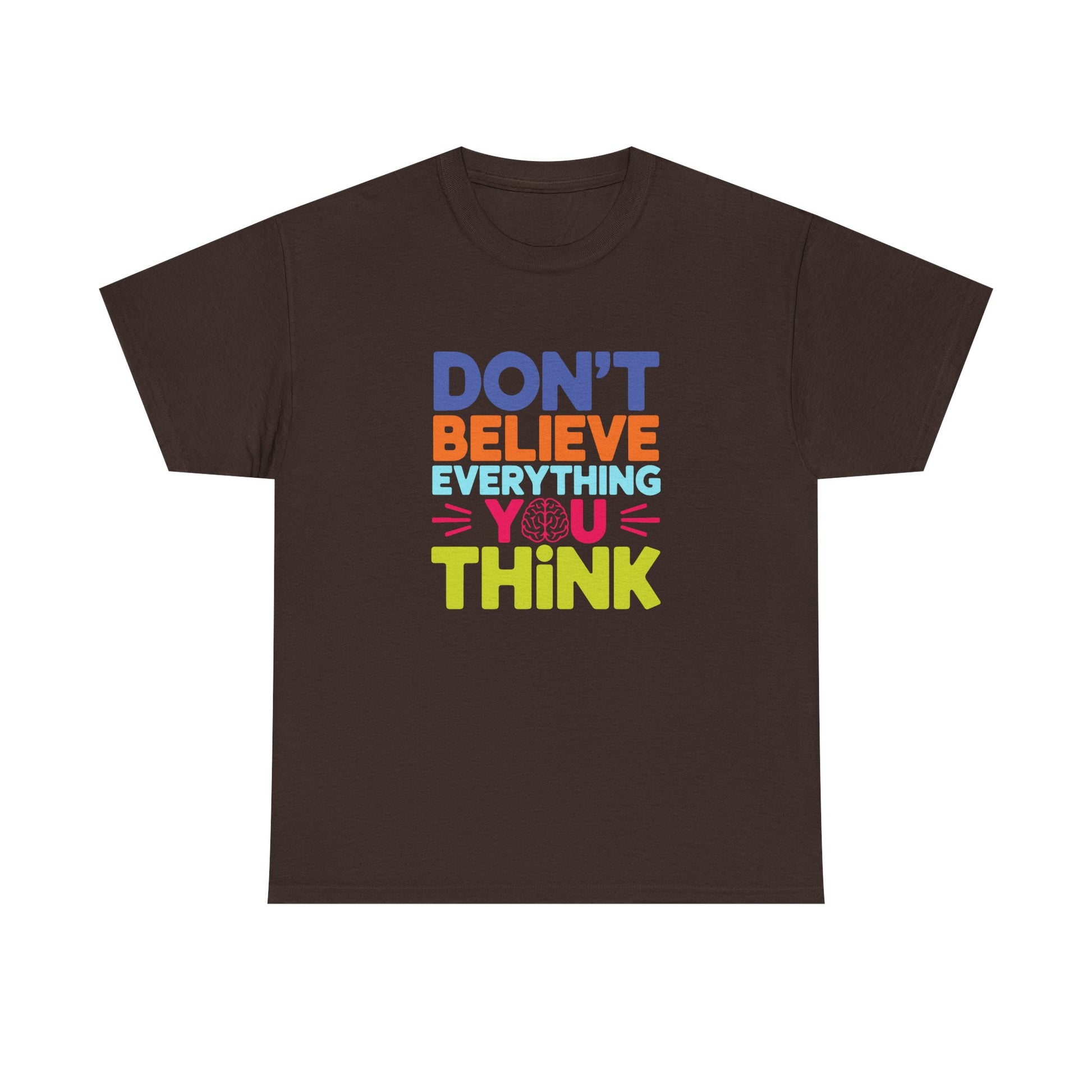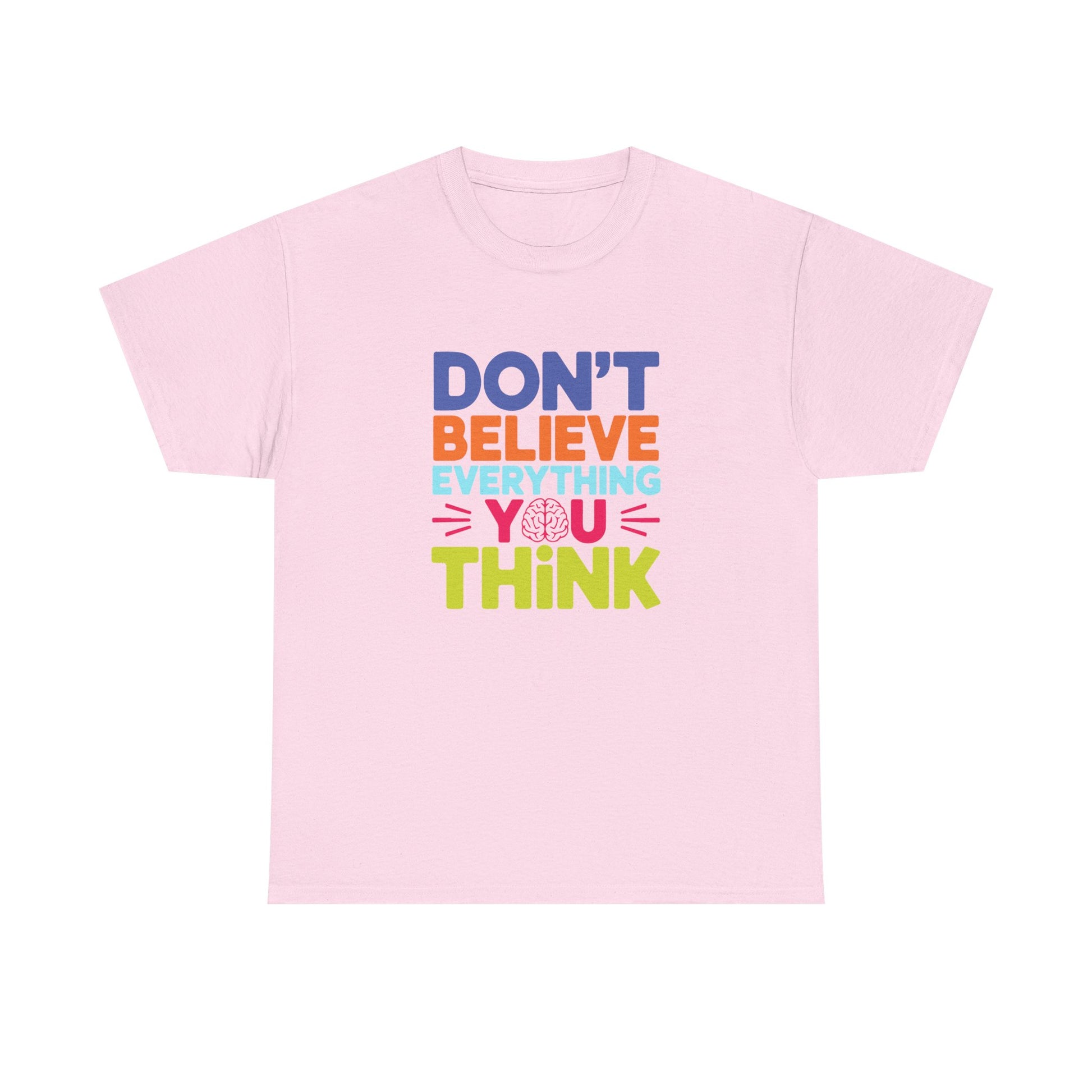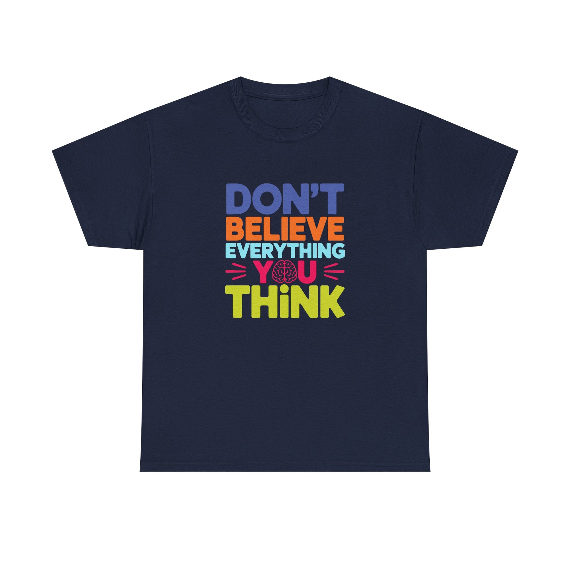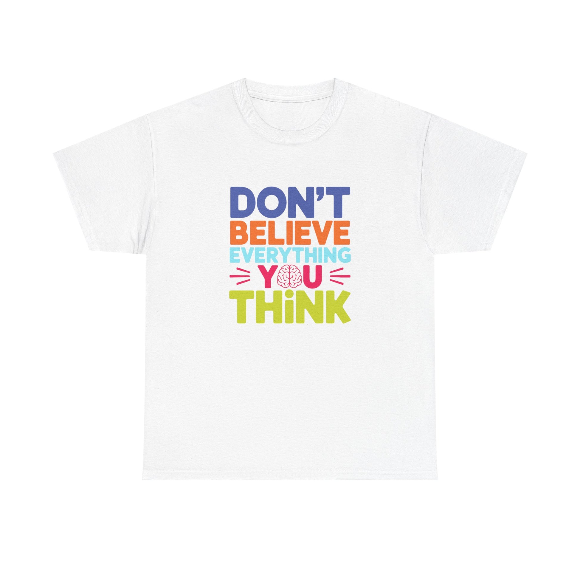 A unisex heavy cotton tee with a powerful message - 'Don't believe everything you think tee shirt'. Perfect for those seeking comfort and style while making a statement. Ideal for adults, this tee is made from high-quality fabric and comes with a 2-year warranty. Suitable for year-round wear due to its medium fabric weight and classic fit.